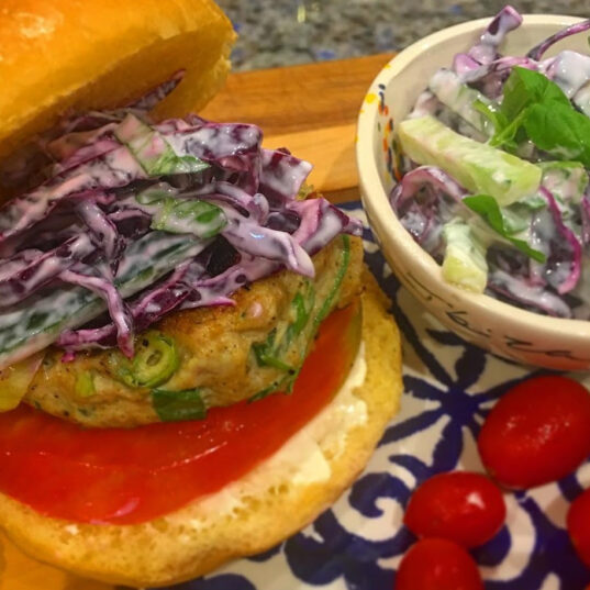 - Serve inside a burger bun (we love brioche buns) with a slice of juicy tomato and top with the slaw.