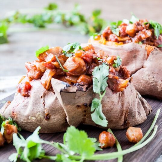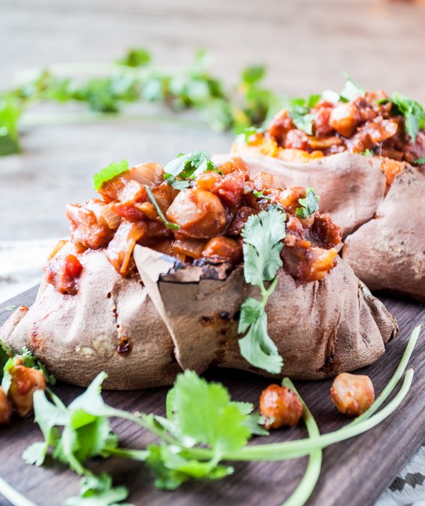 - To serve, slice open the sweet potatoes and scoop a healthy portion of the chana masala into each. Top with a dollop of coconut yoghurt and garnish with the rest of the chopped coriander and pomegranate seeds.