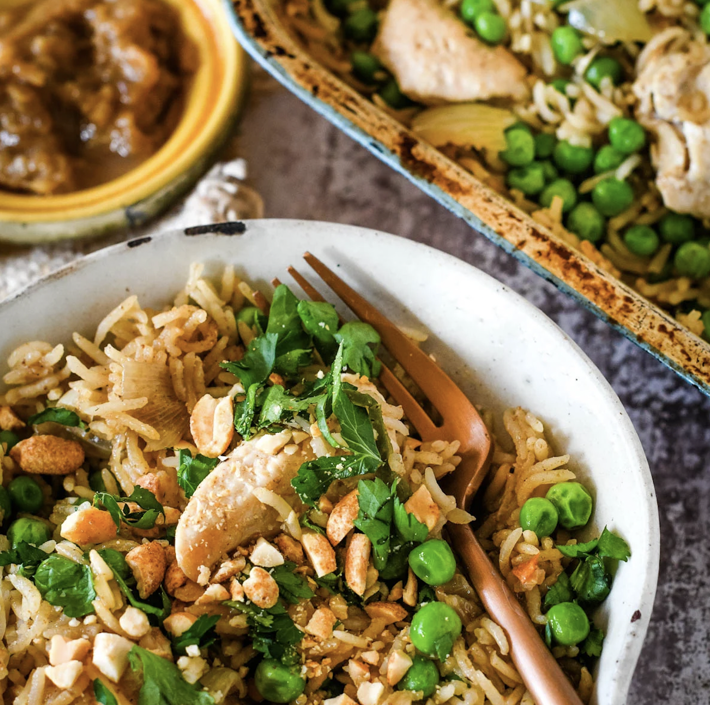 6. Once done, squeeze the lemon juice over and serve your chicken and rice with a sprinkling of fresh parsley or coriander and some dry roasted peanuts too if you like.