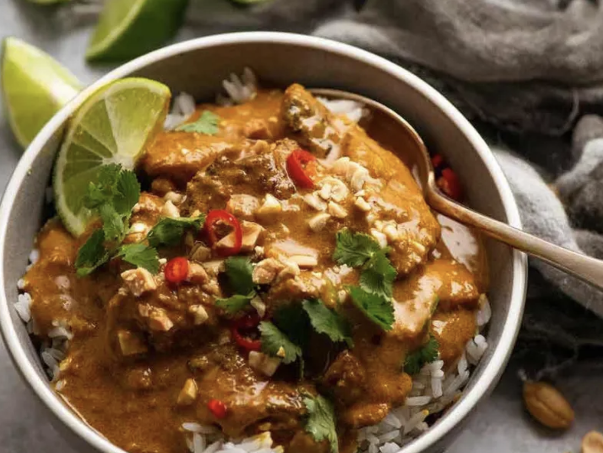 - Continue to simmer for 40 minutes stirring often. Check to see if the chicken is cooked all the way through. Turn off the heat, add the lime juice and check seasoning. Leave to rest for 10 minutes. Scatter over the sliced chilli, spring onions, fresh coriander and rest of the peanuts. Serve with Shemin’s Indian Breads