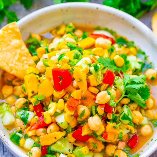 1. Put the chickpeas in a sieve, rinse under cold water, then leave to drain while you make the salad. In a bowl, mix the mango, tomatoes, cucumber, corn, mint, coriander, onion and half the chilli. Dress with half the lemon juice, the sugar, olive oil and Shemin’s Garam Masala, then chill.