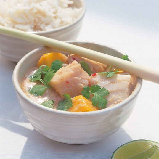 - Add the coconut milk and bring to the boil. Add the monkfish then reduce and simmer for 5-6 minutes until the monkfish is cooked (it will be firm to the touch and opaque).