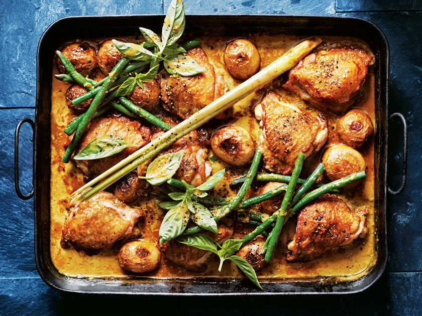 - Remove the chicken from the tray. Add the Shemin’s Massaman Curry Paste, stock, coconut milk, lemongrass and kecap manis, to the tray and mix to combine. Return the chicken to the tray, skin-side up. Cook for 40 minutes or until the potatoes are golden and the chicken is tender. Top with basil and pepper, and serve with green beans.