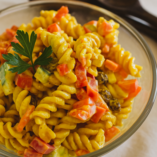 Add the cooled pasta, cucumber, red pepper, red onion, and coriander to the bowl. Mix until everything is well coated in the curry yogurt dressing. - Season & Chill