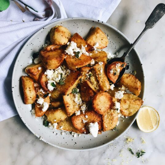 4. While potatoes are still warm, toss with Shemin’s Harissa Spice Blend, feta, and sprinkle with a bit of coriander before serving.
