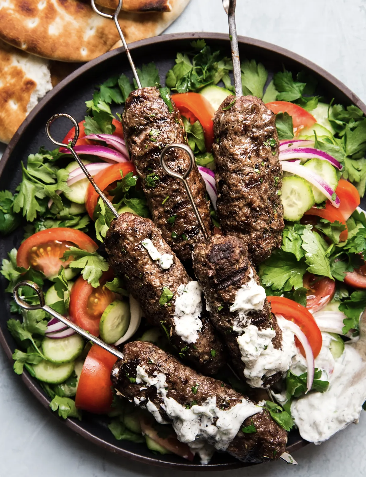 - Serve the kofta skewers hot with warm pitta (or Shemin’s Indian Breads), houmous, tzatziki sauce, fresh feta, tomatoes, cucumbers, olives, sliced red onions and whatever else you can dream of.