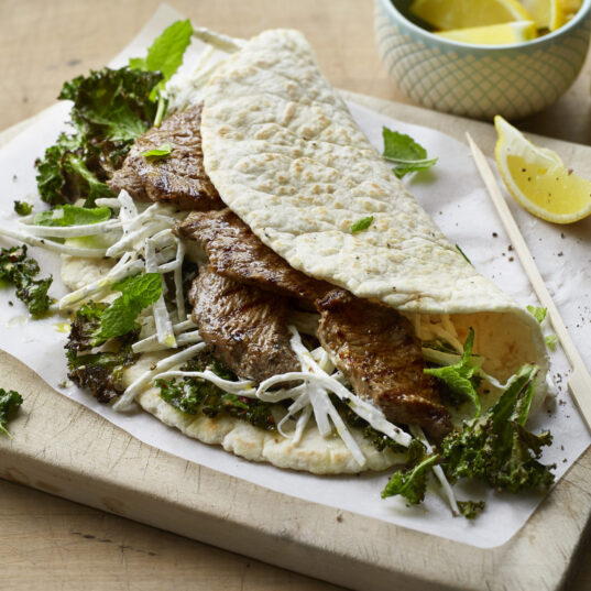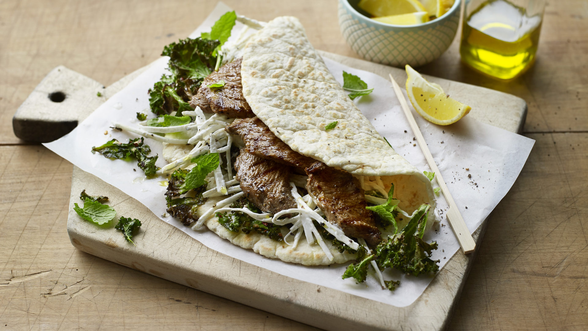 - Place the flatbreads side-by-side on a board and fill with the celeriac slaw, crispy kale and lamb. Drizzle with a little olive oil and roll the bread around the filling.