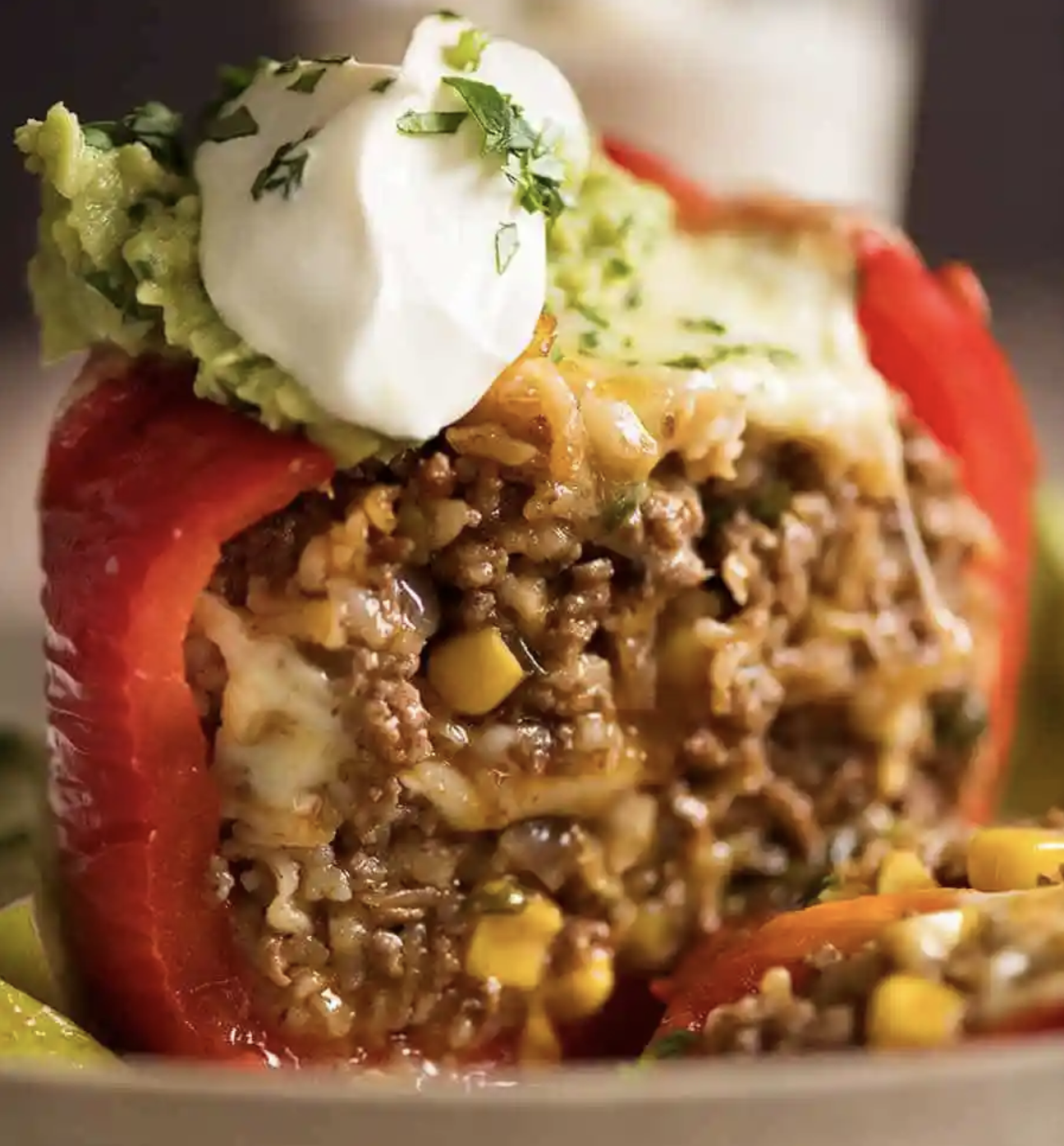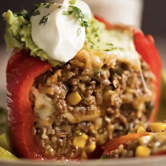 - Spoon half of the filling into each prepared pepper. Top each pepper with half of the grated mozzarella cheese. Fill the peppers to the top with the remaining beef and rice mixture. Place the pepper lids back on. Pour the water into the baking dish. Cover the dish tightly with foil.