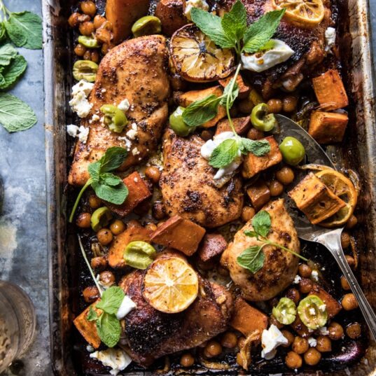 TIP: If you’re vegetarian, swap out the chicken to make a sumptuous vegetarian traybake of sweet potato and chickpeas.