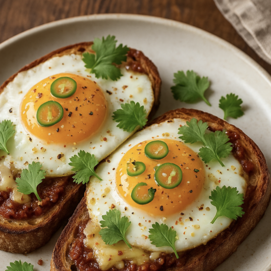 - Assemble: Place the fried eggs on top of the cheesy toast. Sprinkle with Shemin’s Chilli Garlic Salt, sliced green chillies, and coriander leaves.