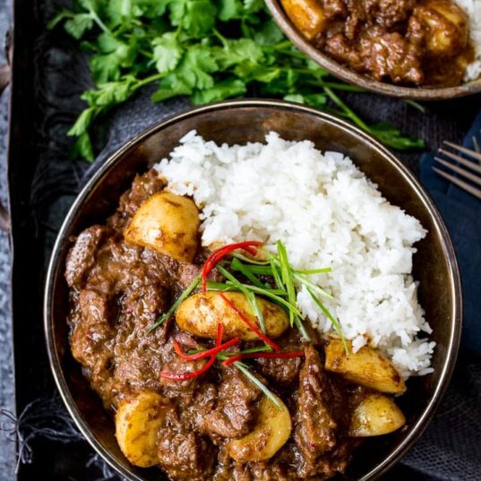 - Heat a large, lidded, flameproof casserole dish over a medium–high flame. Once hot, add 4 tablespoons of the coconut cream from the coconut milk and all of the curry paste. Fry for 1-2 minutes, stirring frequently, until aromatic. Add the ox cheek, stirring frequently, and fry for another 4 minutes, or until browned on all sides.
