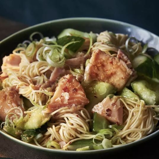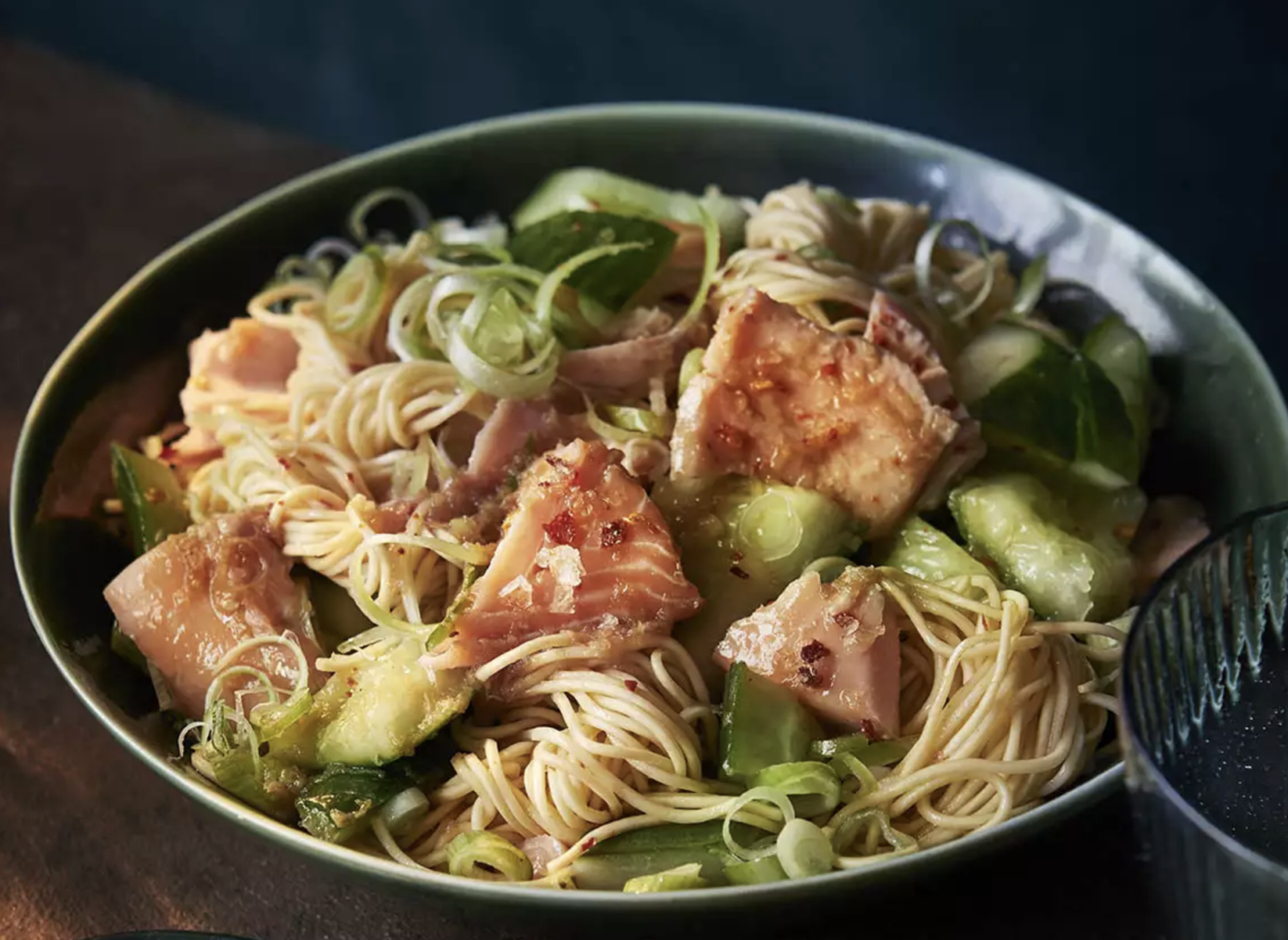 Add the noodles and salad onions to the cucumber and dressing. Toss everything together. Divide between two bowls, top with flaked salmon and finish with a good pinch of Shemin’s Chilli Garlic Salt. Serve and enjoy.