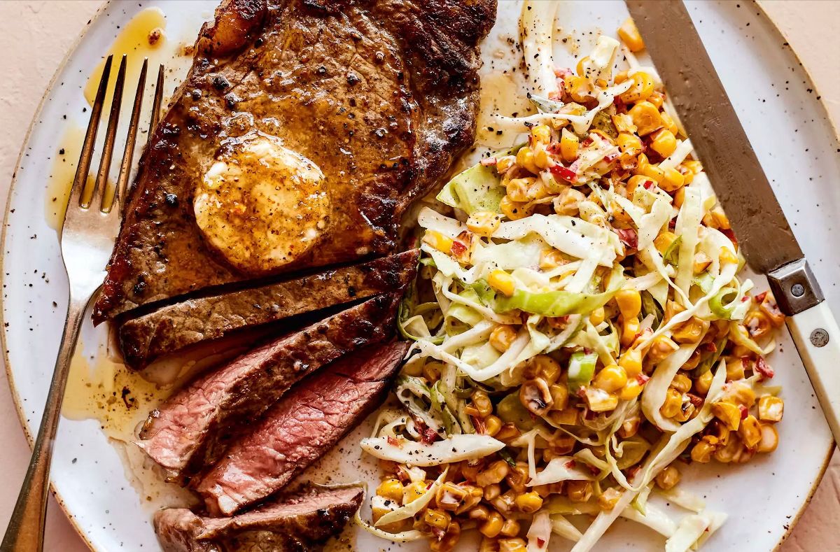 - When cooked, put on a plate and immediately top the steaks with half the Cajun butter for each steak. Cover loosely with foil allowing the butter to melt and the steaks to rest for a minute. Serve with the slaw and chips or a baked sweet potato.