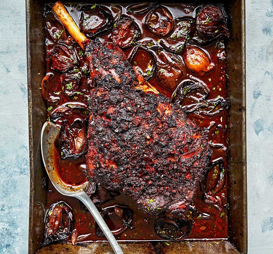 2. Make 15 cuts, about 3-5cm long, all over the lamb and rub the paste all over the lamb and into the cuts. Scatter the onions into a large roasting tray and sit the lamb on top. Leave at room temperature for 1 hour, or cover and chill overnight.