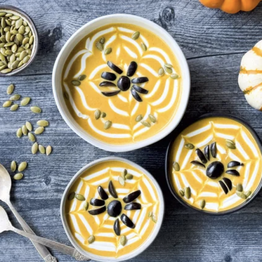 - Spider Web: Scoop the coconut yogurt or sour cream into a disposable pastry bag or zip-top bag, twisting the end to seal. Ladle the soup into warmed bowls. Cut off a small tip of the bag, and pipe a spiral pattern on top of each bowl. Drag a cocktail pick or chopstick from the centre outward to create a spiderweb effect.
