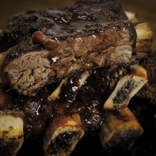 Brown the ribs directly on the BBQ for colour, then transfer to a foil tray or baking tray. Close the lid and cook at ~135°C for 1 hour. Wrap the ribs in foil and continue cooking for another 1.5 hours. Unwrap, increase heat to 150°C, and cook for a final 30 minutes. -