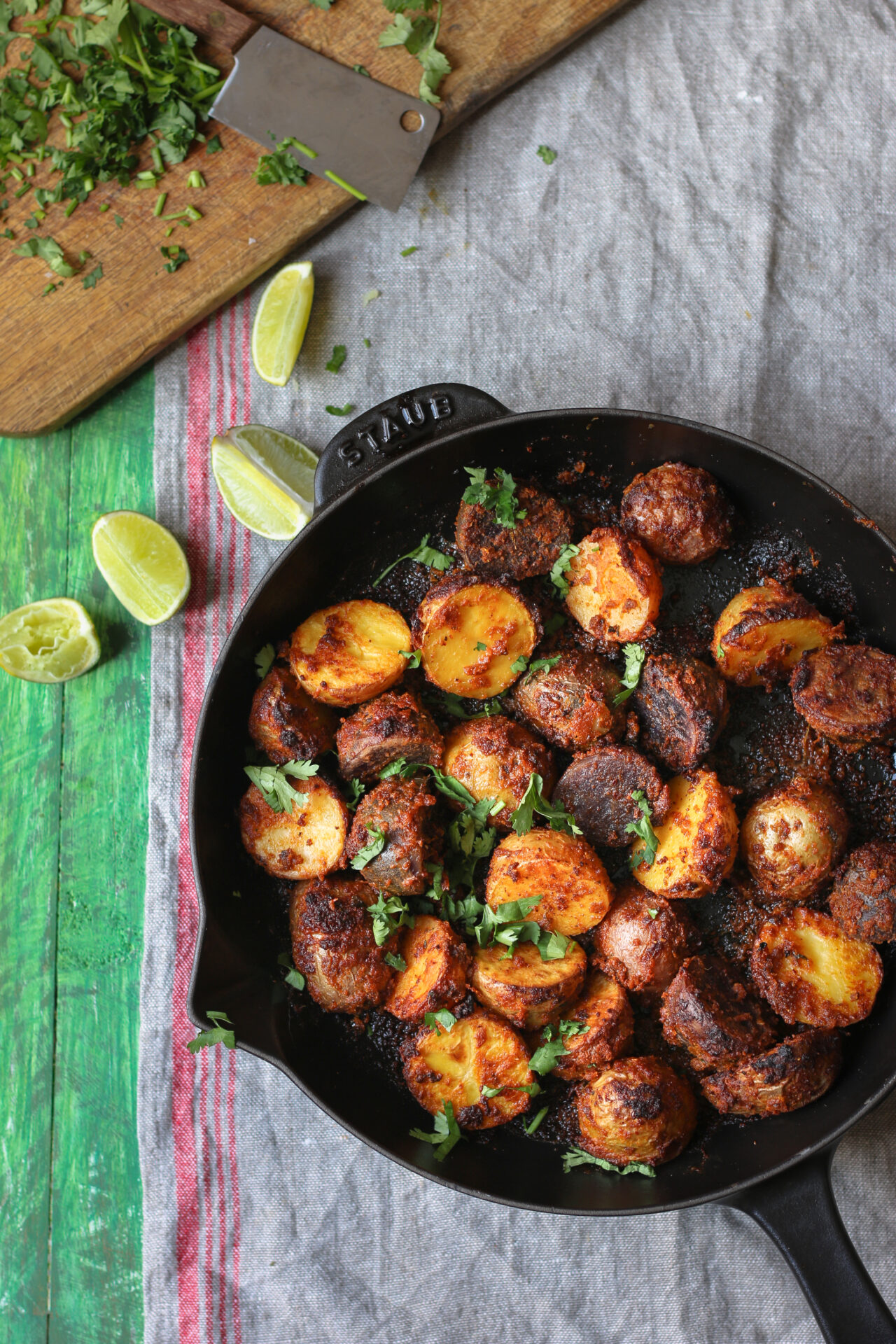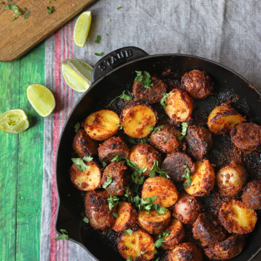 2. Wash and dry the potatoes. Cut into 1/4″ chunks and toss with olive oil and then sprinkle desired amount of Shemin’s Tandoori Spice Blend and toss again so the blend is evenly distributed. Spread into a single layer on a baking tray.