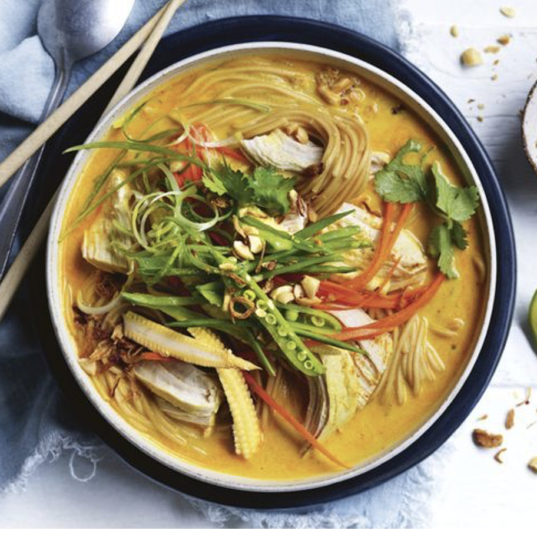 - Divide the soup among serving bowls. Top with carrot, snow peas, and spring onions