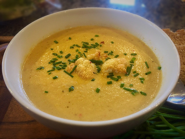 5. Season to taste. Ladle the soup into bowls. Top with some of the roasted cauliflower florets and a sprinkle of chives before serving.