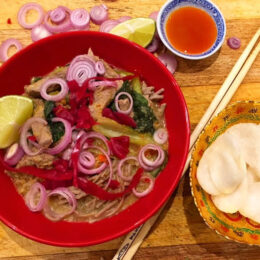 - Take 400ml of coconut milk and add 100g of Shemin’s Thai Red Curry Paste with 1tsp palm or brown sugar and 1tbsp fish sauce or soya sauce. Simmer for 4-5 minutes.