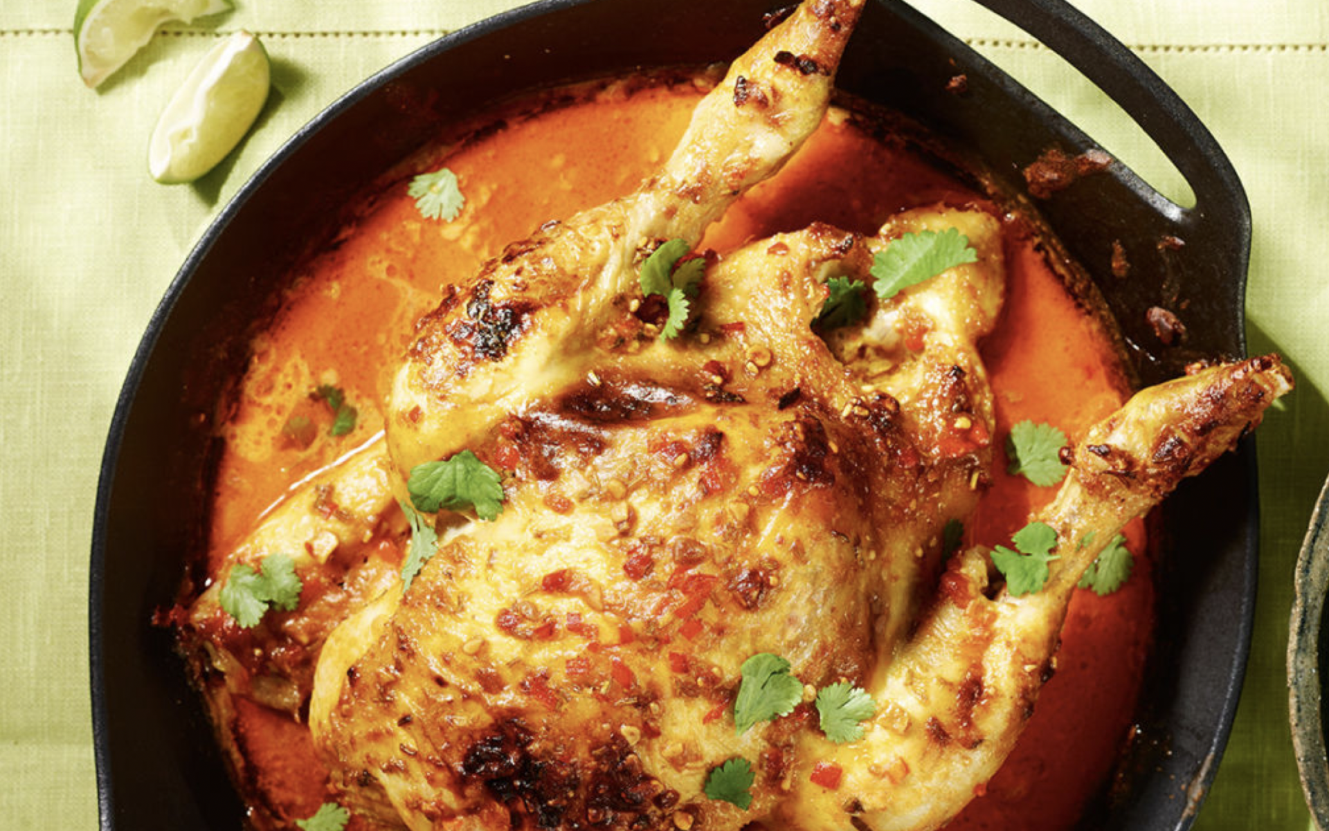 - Take the chicken out of the oven, baste with the sauce again, cover with foil and leave to rest for 10 minutes. Once the ten minutes are up, cut coriander and then cut the chicken to plate.